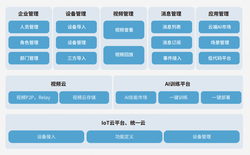 360视觉云平台对于企业用户,提供了专业而稳定的N+2+1的企业管理。N代表SaaS层的组件管理。通过企业管理组件,基于RBAC和ABAC的权限管理,可以对人员、角色、部门进行统一管理;通过设备管理组件,可以将生态设备、自研设备、第三方设备通过绑定、导入、转接等方式进行添加并统一管理;通过视频管理组件,进行视频查看、回放、语音对讲等功能;通过消息管理组件,可以进行站内信的信息推送、钉钉、企业微信的消息推送;通过应用市场组件,可以对AI市场、场景进行管理。2代表底层的视频云和AI训练平台,通过360专业稳定的底层云平台,提供推理->数据采集->训练->推理的AI闭环。1代表底层的IOT统一云平台,通过MQTT协议对设备进行统一的功能定义、设备管理。