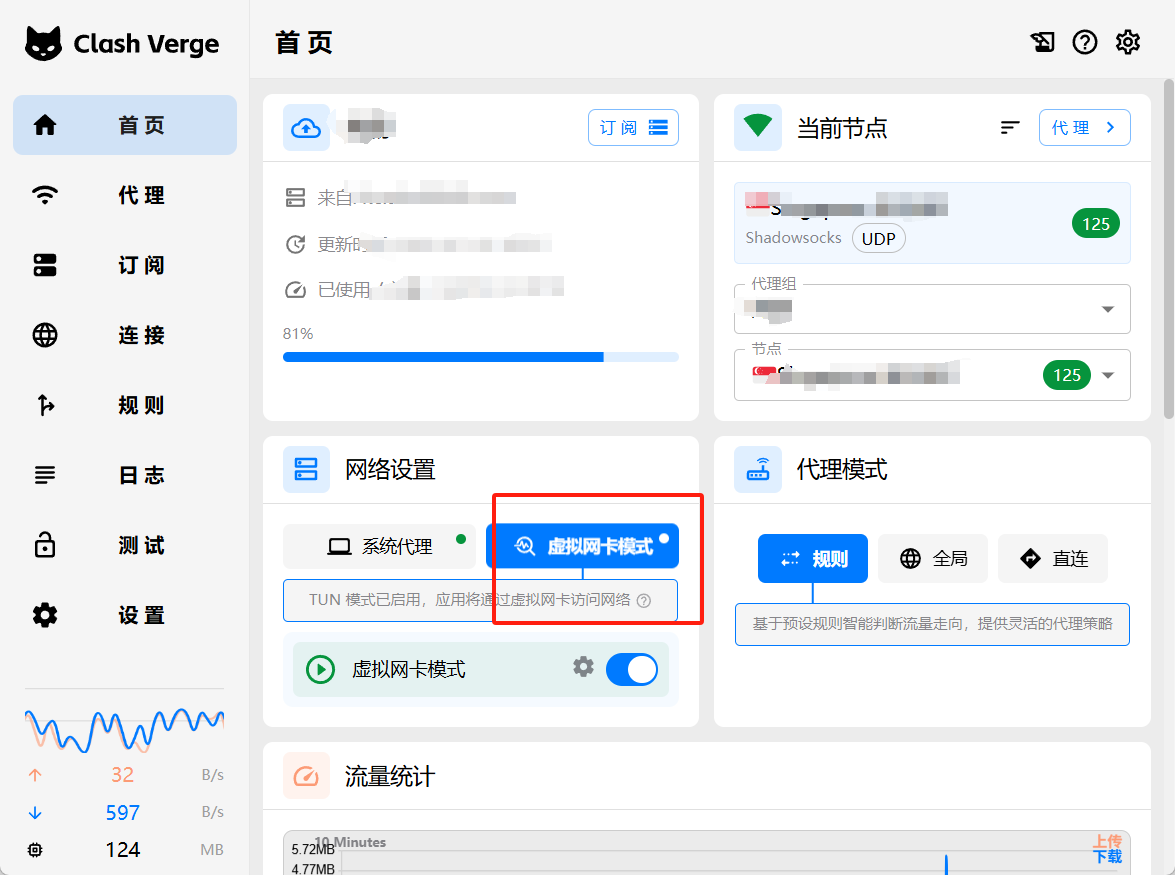 打开clash工具,改为虚拟网卡模式。这里说一下2者的区别: