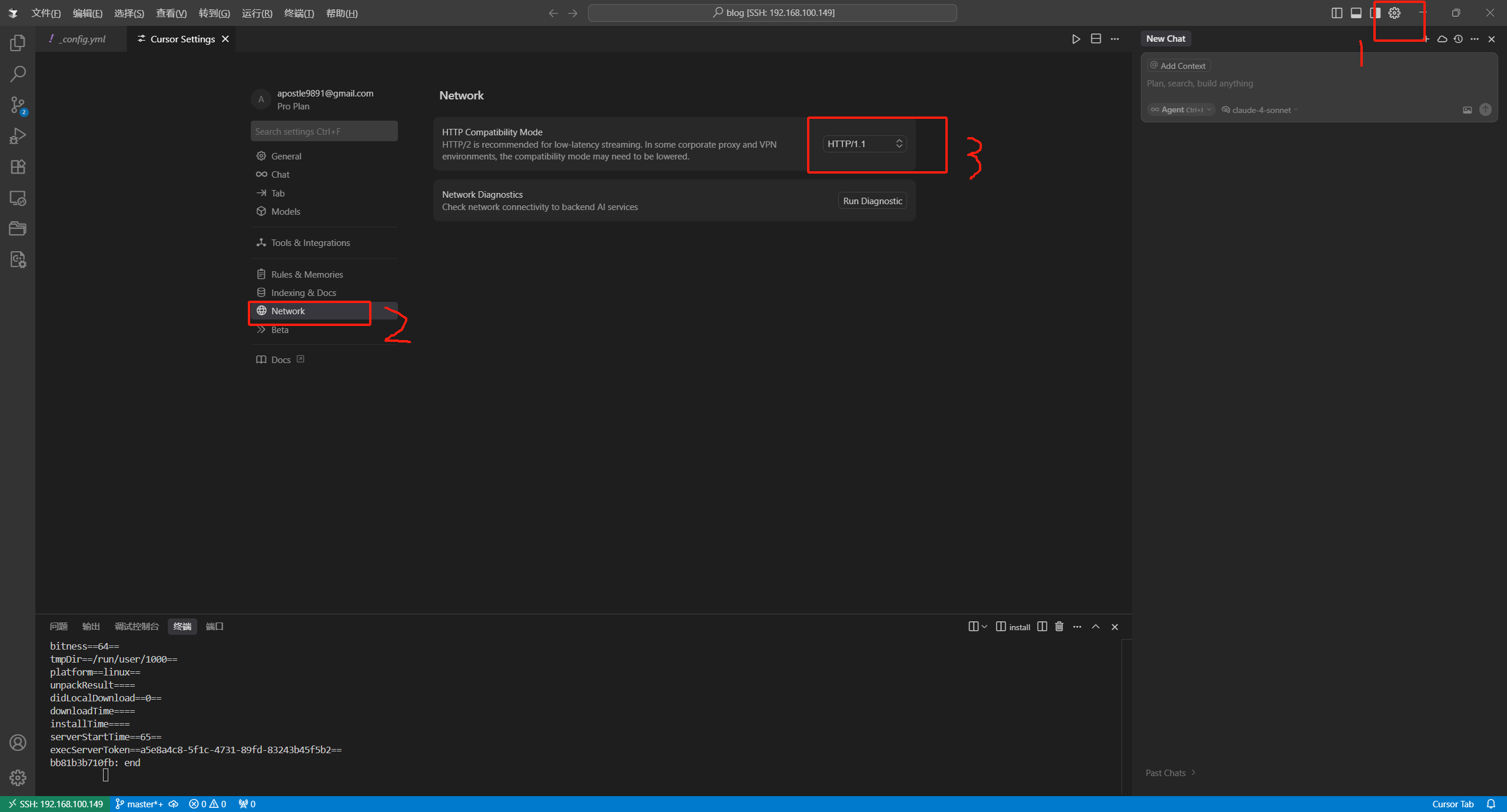 打开设置-cursor设置-网络,选择http1.1,然后就可以使用了。