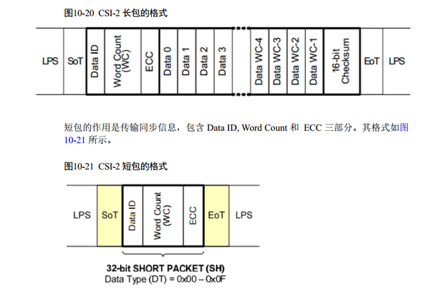长包用于传输有效像素数据,分为五部分:Data ID, Word Count, ECC, PAYLOAD, Checksum。