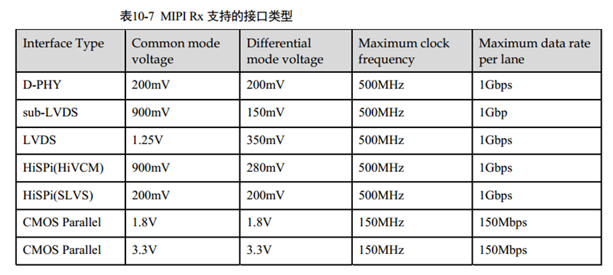 海思所支持的MIPI Rx是一个支持多种差分视频输入接口的采集单元,通过combo-PHY接收MIPI/LVDS/sub-LVDS/HiSPi/DC接口的数据,通过不同的功能模式配置,MIPI Rx可以支持多种速度和分辨率的数据传输需求,支持多种外部输入设备。MIPI Rx最大支持1Link/4Lane MIPI输入、1Link/4Lane或2Link/8Lane LVDS输入以上输入。管脚可复用为单端DC/BT.1120通道输入,从而可以用更少的芯片管脚提供更好的兼容性。