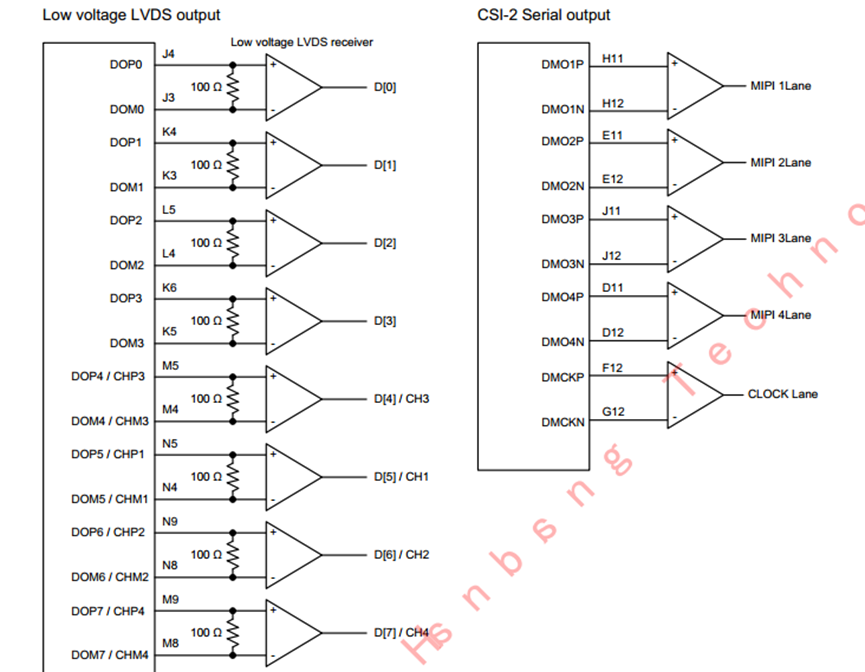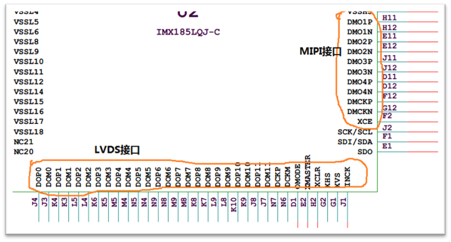 具体是使用LVDS还是MIPI接口,根据硬件电路来确定,也就是根据我们自身硬件选择,有些芯片支持LVDS与MIPI两种接口,有些芯片不支持,具体需要查看芯片自身。一般来说,在硬件电路中,LVDS的接口使用名称叫做DOPX/DOMX,而MIPI的接口一般为DMOXP/DMOXN,以IMX185来说,硬件抽象接口如下: