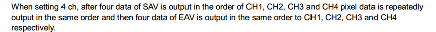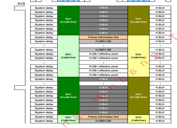我们可以看到,图像的同步码按照图像配置来设置,我们一般用12位数据,其中每个同步码一般为四位,按照SAV(invalid)EAV(invalid), SAV(valid),EAV(valid)顺序来说12位的同步码为:
