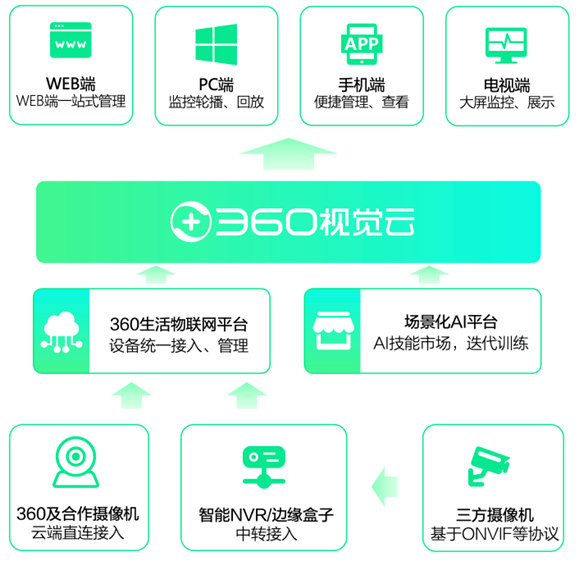 360视觉云平台是基于已有的PaaS层和C端平台,面向中小B使用与二次开发集成场景进行场景化定制封装的SaaS与aPaaS平台。采用B端、C端一体化架构设计,底层复用360过去八年来在安防领域的沉淀和技术积累,统一接入360生活物联网平台。通过一键导入设备,即可使用视觉云平台,进行更灵活的进行设备、人员、权限管理,根据场景对AI技能进行订阅。
