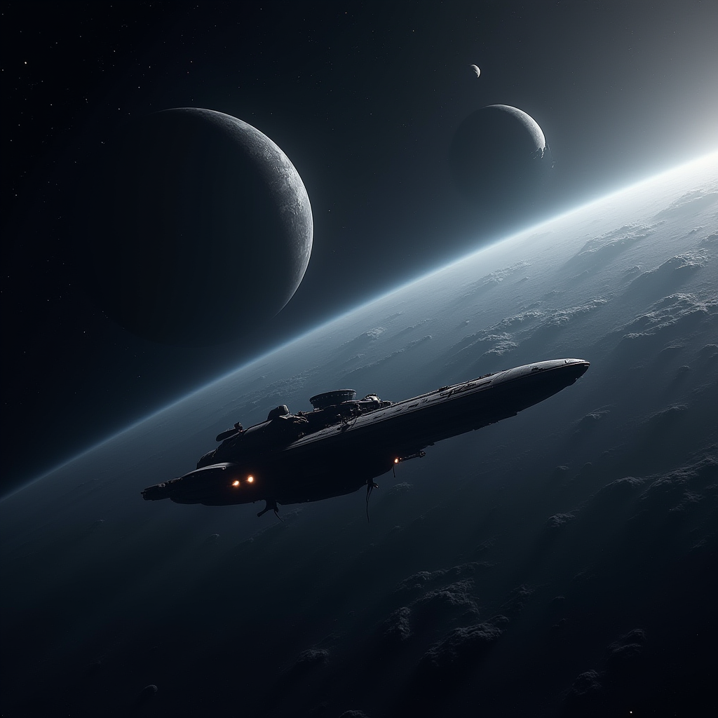 1 2 3 在深邃的太空中,背景有小星球,一架宇宙飞船在画面正中心 In the depths of space, with small planets in the background, a spacecraft is at the center of the scene.
