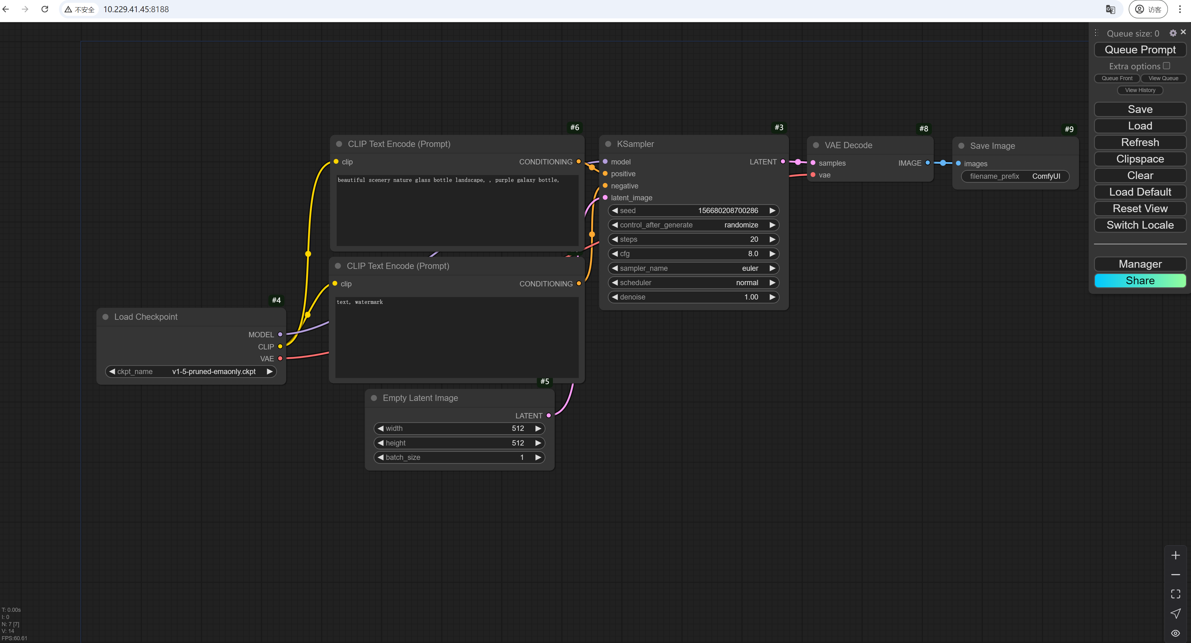 3. 使用 3.1 浏览器初始化 打开浏览器,在网页中输入自己的IP:8188, 比如我的IP是10.229.41.48,则输入: