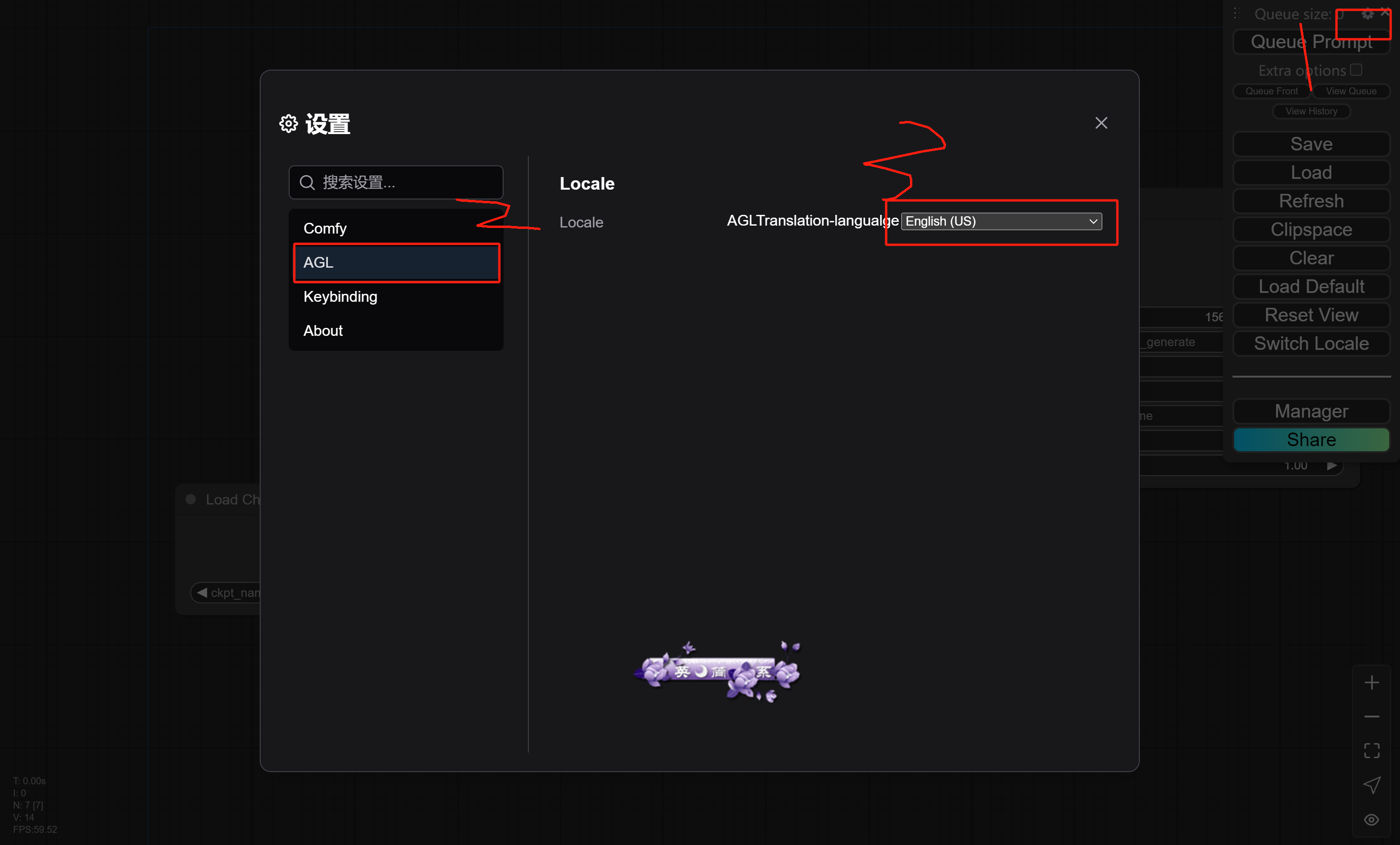 选择设置-AGL,改成中文,如果没有中文选项,重新在第二步看一下是否正确下载了语言包 下载提示词的示例图片,flux_schnell_example示例获取: