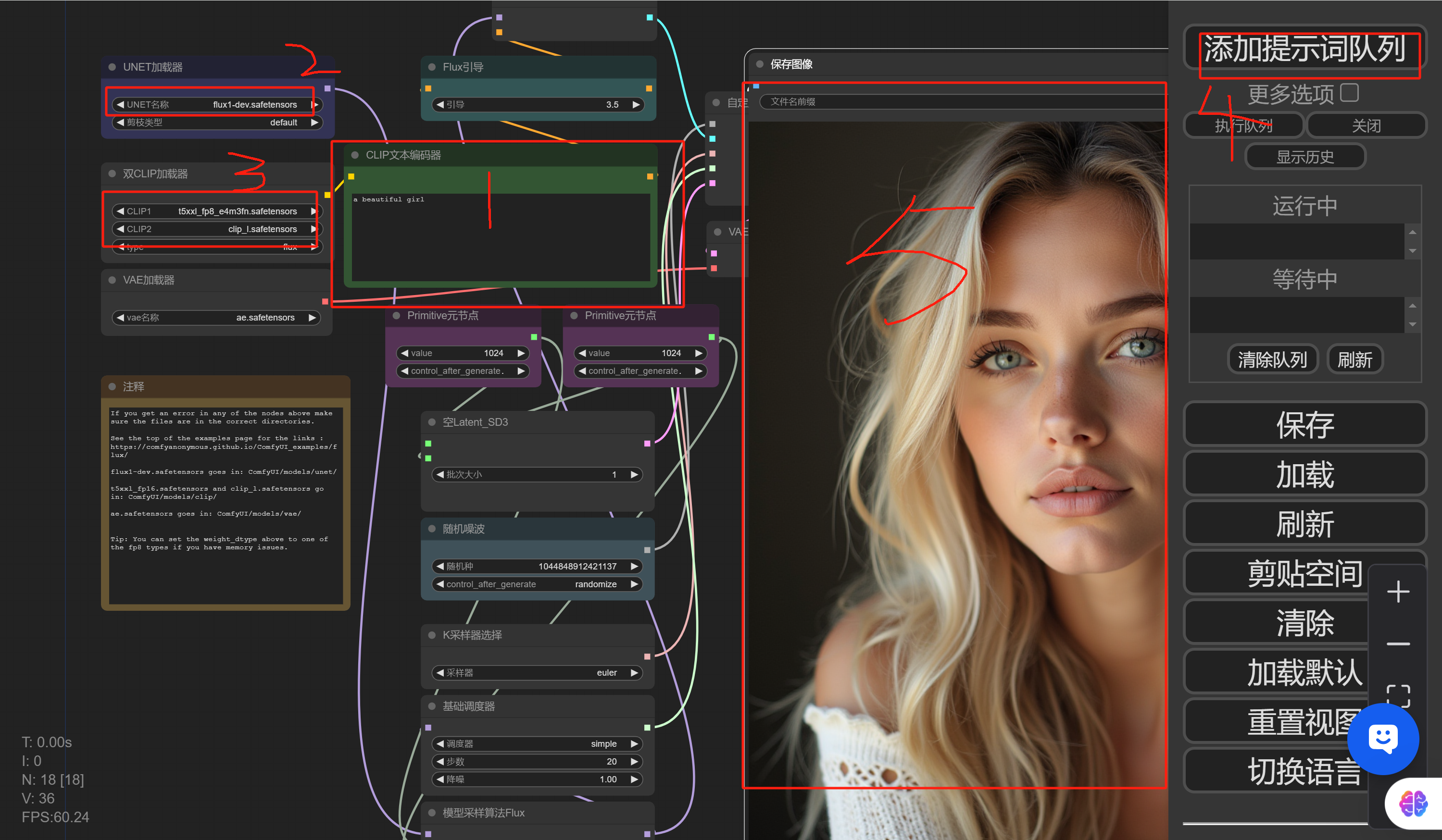比如我用的是flux dev,则下载对应的flux图片 并将这张图保存,直接拖到网页中即可,最终的界面如下,并开始操作: 1)在clip文本编辑器中编写要画的图,比如我编写的是:a beautiful gir 2)选择刚刚下载unet文生图模型,比如我下载的是flux1-dev.safetensors 3) 选择双clip加载器,主要用于将clip进行文本向量化,我下载的是t5xxl_fp8_e4m3fn.safetensors和clip_l.safetensors 4) 选择添加提示词队列,根据设备显卡不同,等待即可在图像区进行图像生成