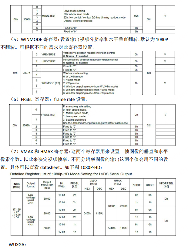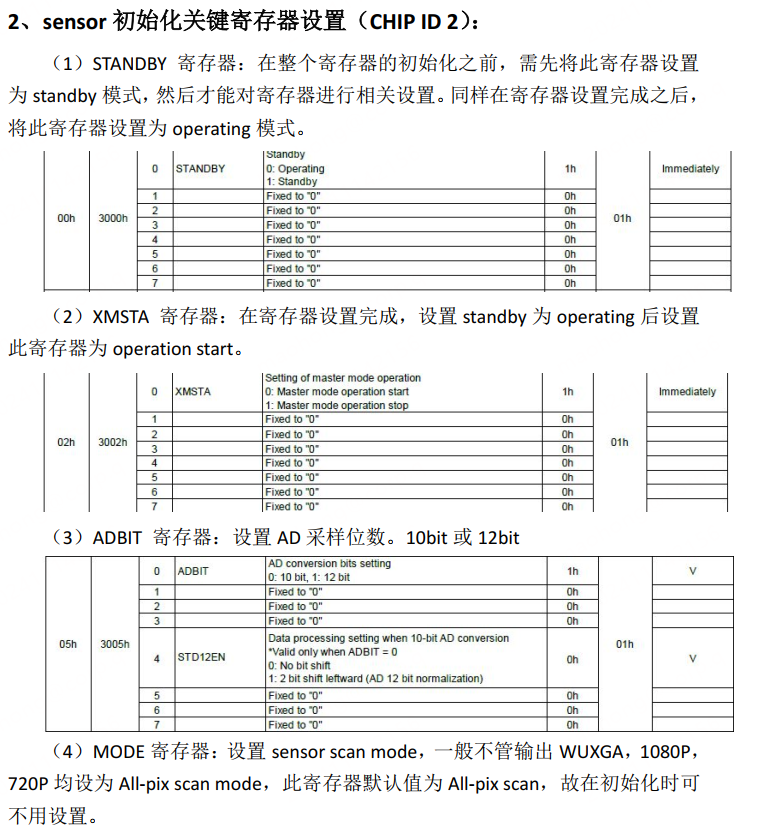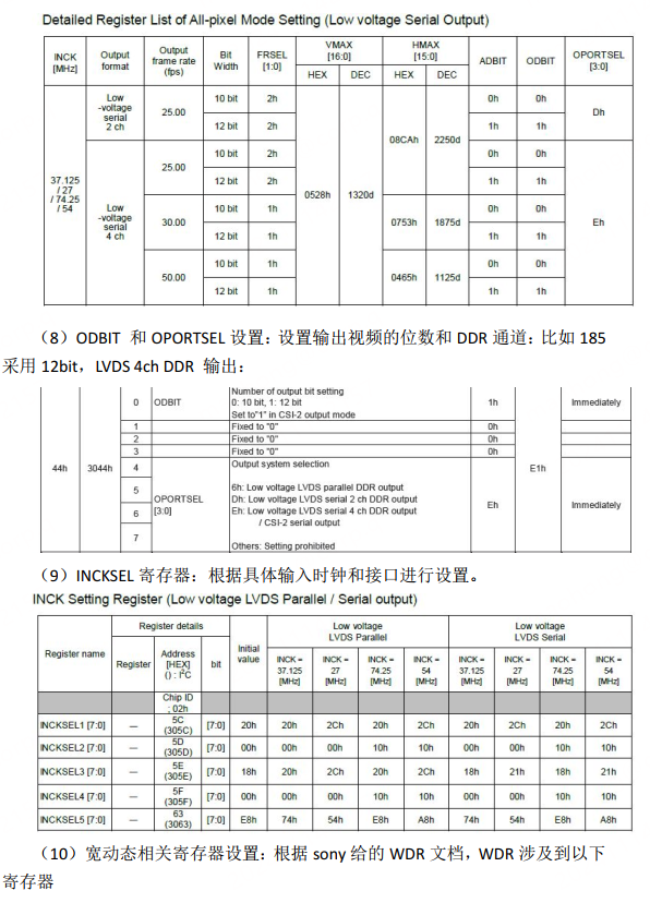 对于 sensor 的初始化寄存器设置,可以利用 datasheet 描述来进行相关寄存器设置。也可以向 sony 要相关的寄存器设置文档,比如此次就跟 sony 要到了imx185 sensor LvDs 的寄存器设置 EXCEL 文档。整个初始化序列可以按照寄存器顺序进行(除个别寄存器,如 STANDBY,SVSOUTSEL,XMSTA 需要在初始化完成后进行设置,使 sensor 进入正常工作模式)。