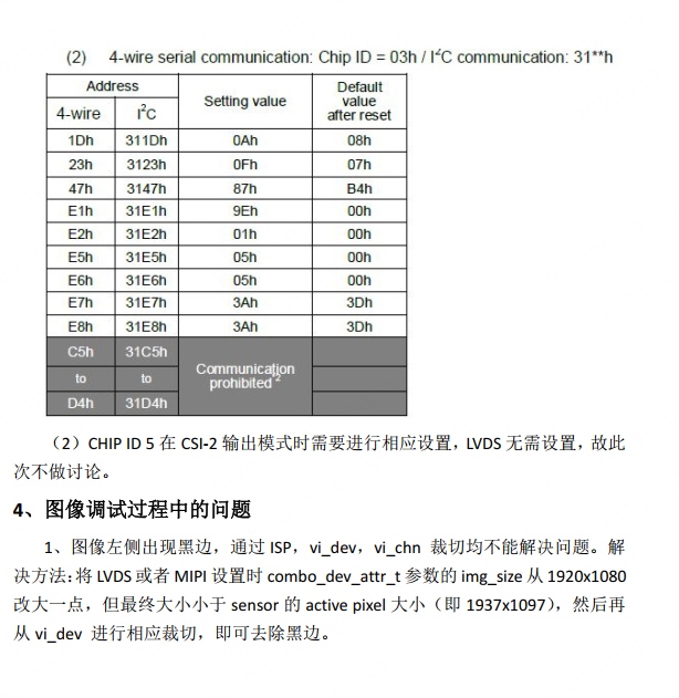 配置思路1. 如何分析视频接口选择使用MIPI还是LVDS,所需要做的工作有:1) 硬件配置正确,即配置正确的公模电压,差分电路,正确的接口。2) 配置相关的MIPI上层抽象接口。3) 配置相关的寄存器操作。注:1、上层硬件配置,此处硬件工作较多,不做深入研究。2、相关寄存器操作主要集中在XXX_cmos.c与XXX_ctrl.c中,具体配置以另外叙述。3、Mipi上层抽象接口为海思抽象出来的接口,此层自行配置了相关寄存器,本文主要基于HI3516D芯片进行配置,这也是本次研究的重点。 2. 如何配置上层抽象接口此处只针对于配置上层抽象接口。主要为LVDS配置,MIPI方式配置较为简单,不做叙述。 查看sensor支持LVDS还是mipi接口。实际操作为查看datasheet,一般前几页会有支持的接口名称,或者搜索LVDS,然后搜索DOP1或者DOM1。LVDS的接口使用名称叫做DOPX/DOMX,而MIPI的接口一般为DMOXP/DMOXN。 查看硬件配置是否为LVDS接口,实际操作为查看硬件电路图。 根据硬件电路图,确定LVDS的lane对接方式。实际操作为对接方式,例如OV4689操作。 根据sensor,查看是否支持宽动态,支持宽动态的方式,配置HI_WDR_MODE。 确定同步方式。实际操作为搜索LVDS,查看是为SOL方式还是SAV方式。 搜寻同步码。实际操作为搜寻sync_code。 3. 视频上层抽象接口配置海思接口配置,结构体如下所示: 123456789101112typedef struct{/* input mode:MIPI/LVDS/SUBLVDS/HISPI/DC */input_mode_t input_mode; union{/* for MIPI configuration */ mipi_dev_attr_t mipi_attr; /* for LVDS/SUBLVDS/HISPI configuration */ ...